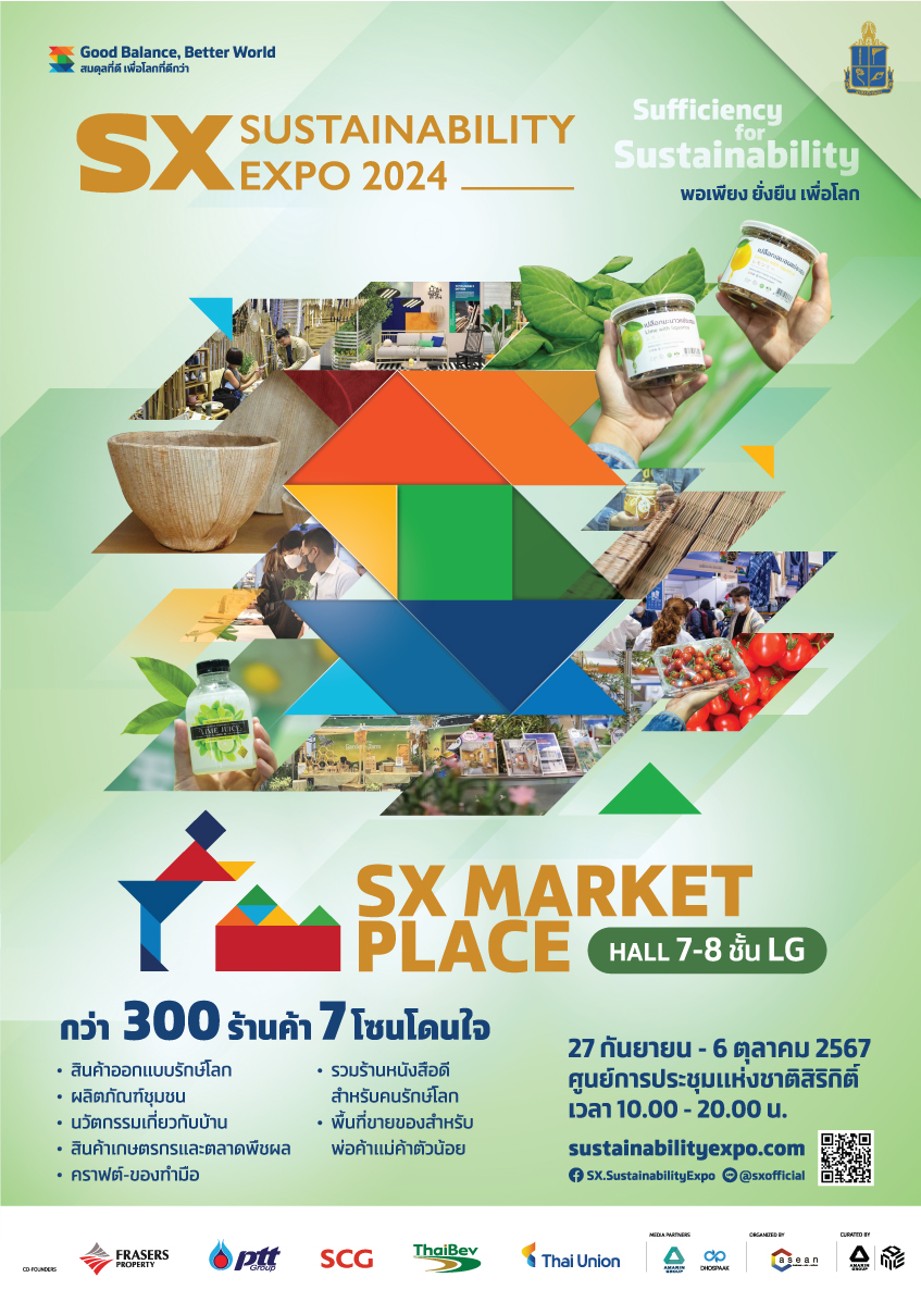 SX Marketplace นอกจากเป็นสวรรค์ของขาชอปแล้ว ยังสนับสนุนธุรกิจยั่งยืนของผู้ประกอบการไทย ตั้งแต่กลุ่มธุรกิจต้นน้ำ กลางน้ำ ไปสู่ปลายน้ำ ให้เติบโตอย่างยั่งยืนไปพร้อมกัน เรียกได้ว่าเป็นตลาดนัดสินค้ายั่งยืนและป็นพื้นที่สำหรับพบปะผู้ประกอบการตัวจริง “เพราะความยั่งยืนเป็นเรื่องของทุกคน” มาร่วมกันเปลี่ยนโลกใบนี้ให้น่าอยู่อย่างยั่งยืนและพร้อมปรับตัว เพื่อความอยู่รอดในวิถีชีวิตประจำวันยุคโลกเดือดได้อย่างมีความสมดุล ในงาน Sustainability Expo (SX2024) ติดตามกิจกรรมดี ๆ ด้านความยั่งยืน ติดตามได้ที่ www.sustainabilityexpo.com, Facebook: Sustainability Expo และแอปพลิเคชัน SX