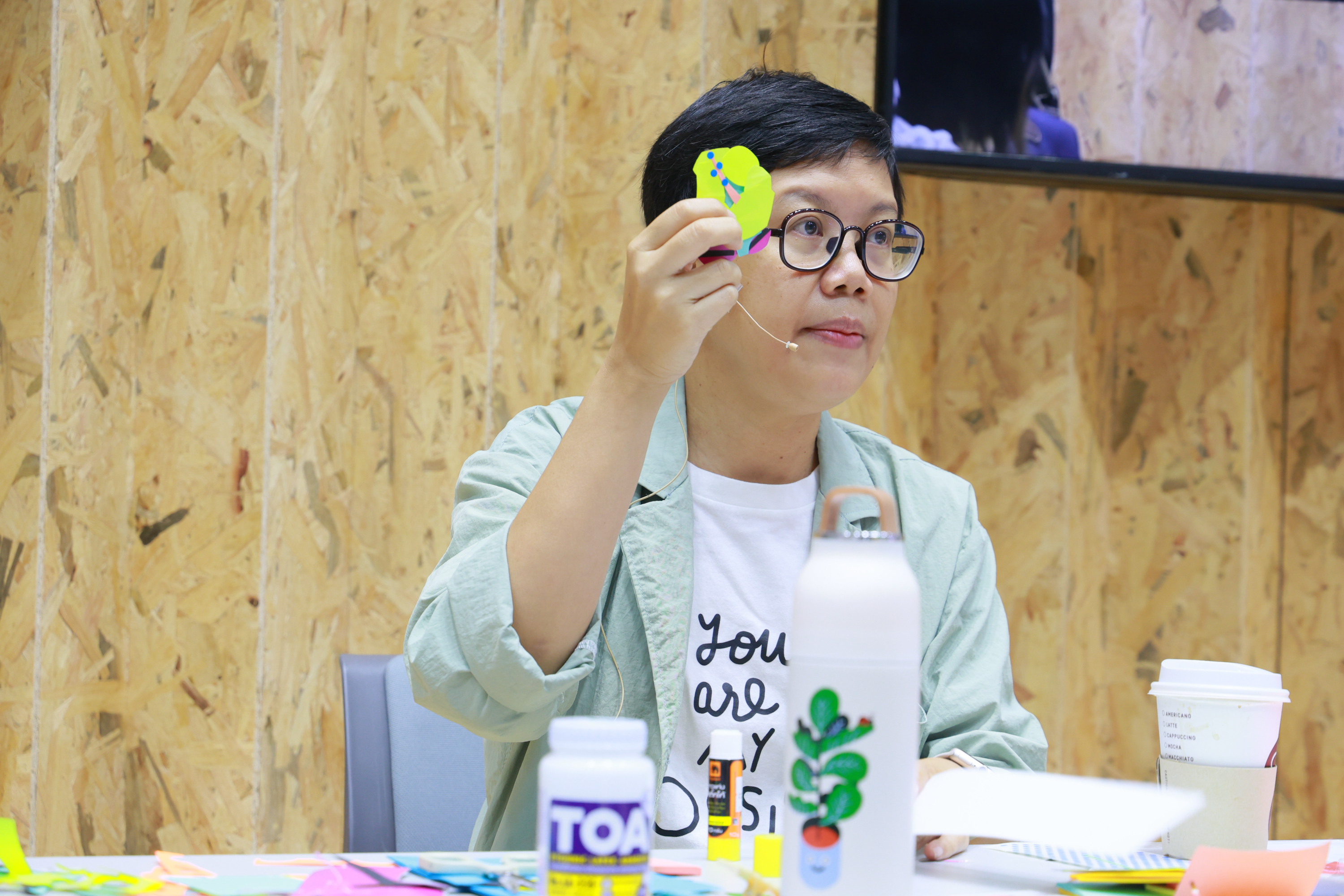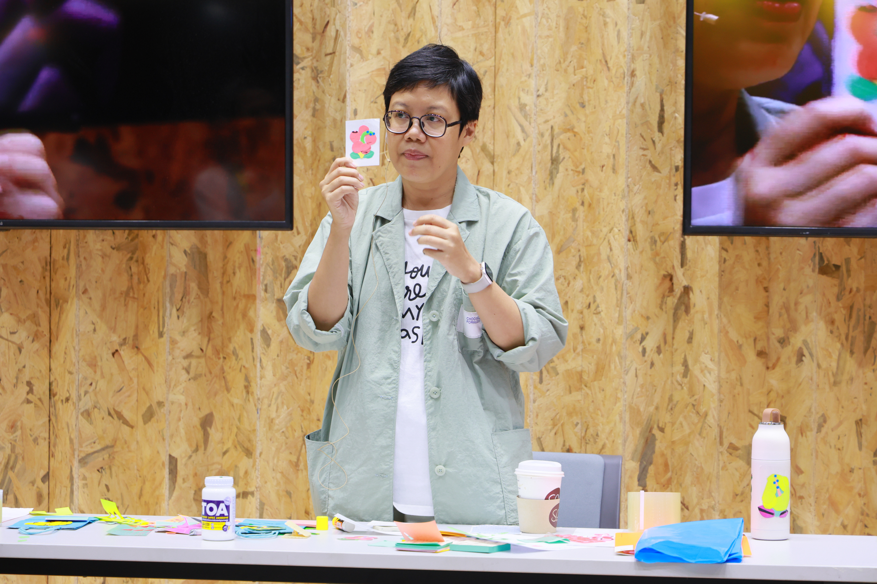 ก่อนลงมือทำเวิร์กชอป คุณแป้ง เริ่มพูดคุยกันก่อนว่า เวิร์กชอปครั้งนี้อยากชวนทุกคนมาค้นพบความสนุกของเศษกระดาษเปลี่ยนจาก “ของที่จะทิ้ง” ให้เป็น “ของที่จะใช้” ลองหันมามองวัสดุที่อยู่รอบตัวเราอย่างเช่น เศษกระดาษที่บ้าน ที่ออฟฟิศ ห่อขนมที่เรารับประทานเสร็จแล้วกำลังจะนำไปทิ้ง ถ้าเรามองเห็นความสวยงามก็สามารถนำมาเปลี่ยนเป็นงานศิลปะ เช่นในเวิร์กชอปครั้งนี้ที่คุณแป้งชวนเปลี่ยนเศษกระดาษให้เป็นสติกเกอร์ดอกไม้สวย ๆ ที่มีชิ้นเดียวในโลก