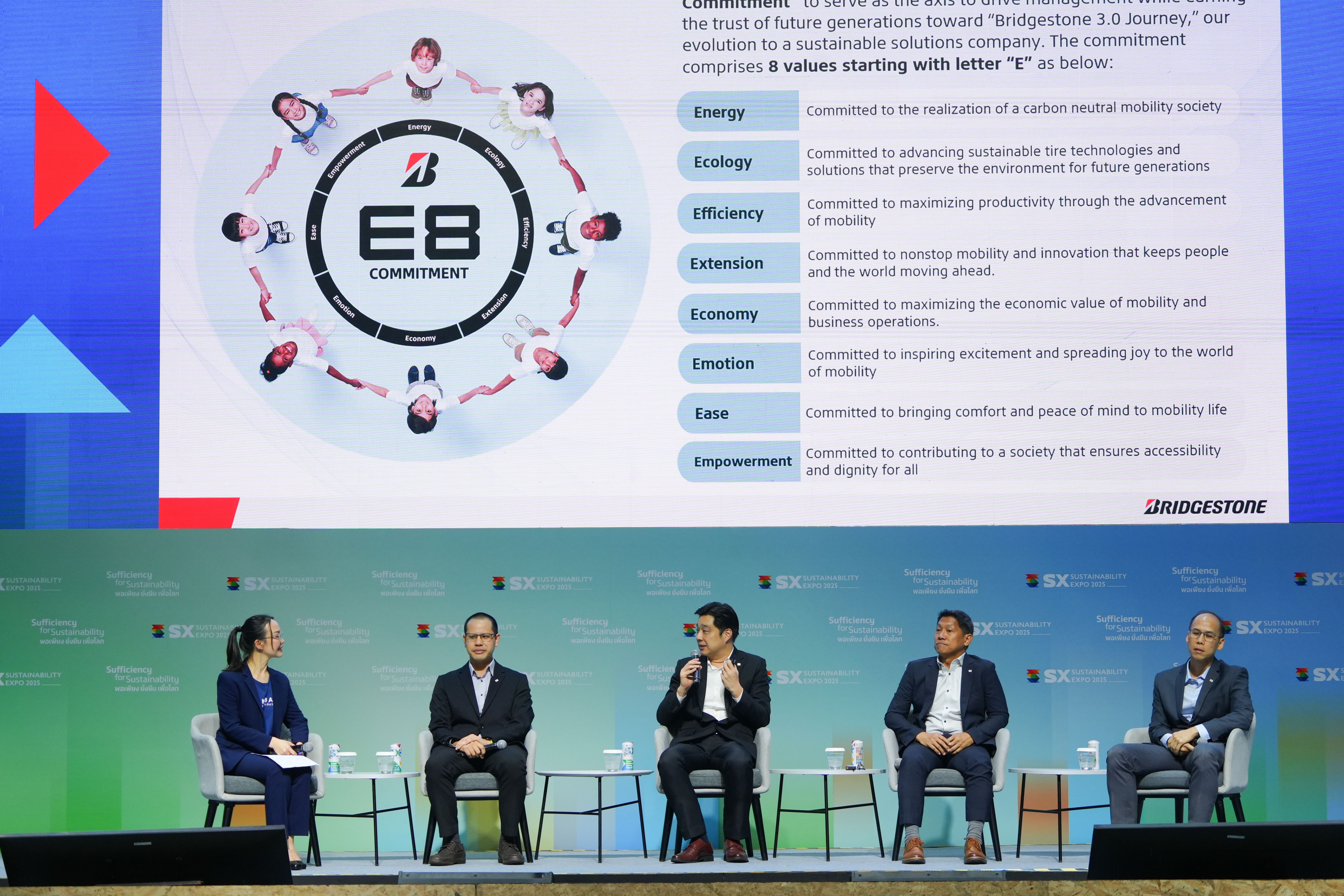 คุณอรรถพล แพ้วงาม ผู้อำนวยการสายงาน Engineering และความยั่งยืน (Director of Engineering and Sustainability) ได้กล่าวถึงการปรับตัวขององค์กรภายใต้พันธสัญญา E8 (แนวทางปฏิบัติเพื่อความยั่งยืน) "BTE [Bridgestone] เรามีตัว Mission ว่า Serving Society with Superior Quality แต่จากการเปลี่ยนแปลงของโลก เราก็เริ่มเน้นเรื่องความยั่งยืน และอยากเป็น sustainable solution company ซึ่งเป็นคีย์เวิร์ดสำหรับ Bridgestone 3.0 เลยครับ"