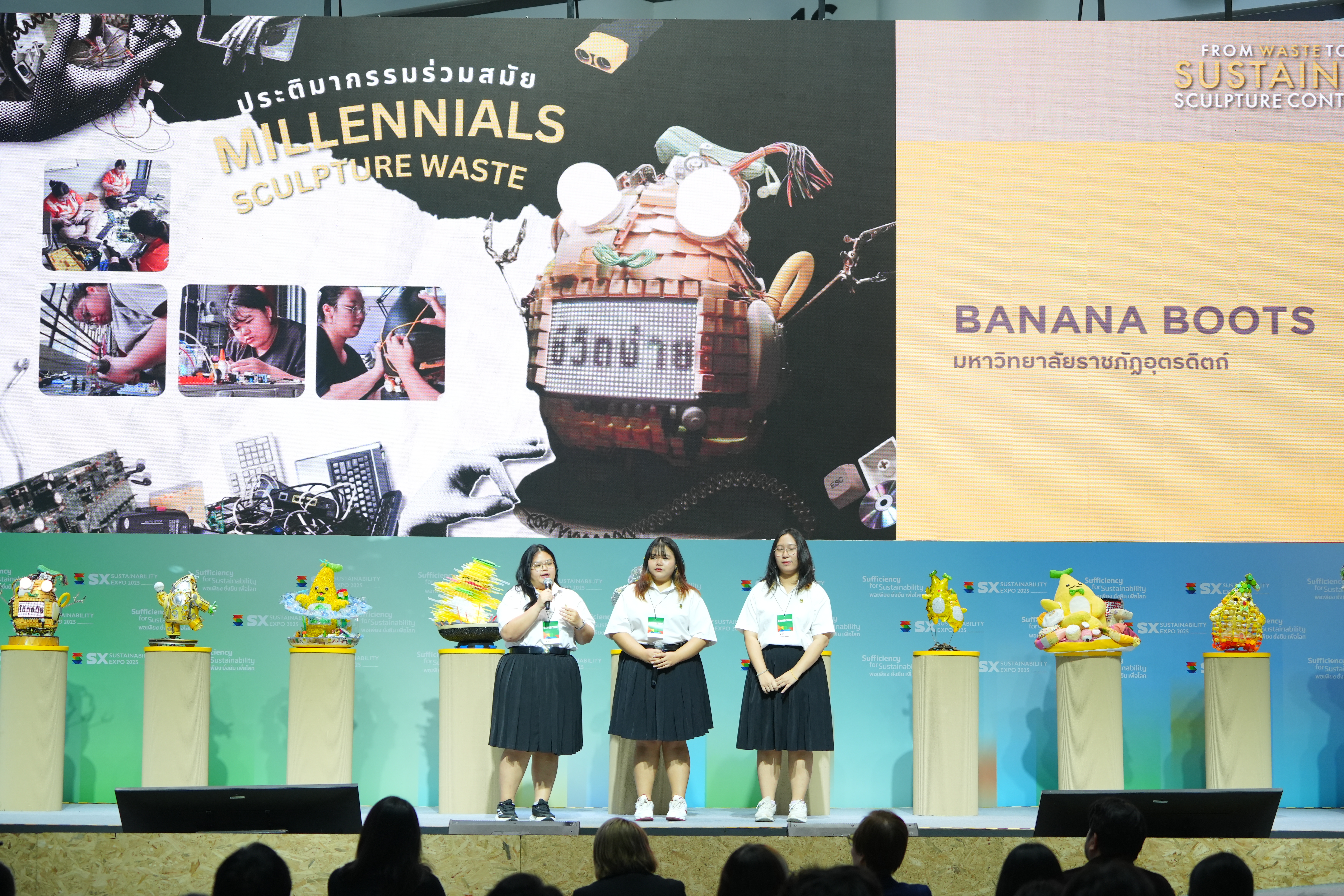 Banana Boots: ผลงานจากมหาวิทยาลัยราชภัฏอุตรดิตถ์ ที่นำขยะอิเล็กทรอนิกส์ เช่น ชิ้นส่วนคอมพิวเตอร์และคีย์บอร์ด มาสร้างสรรค์เป็นน้องกล้วย เพื่อย้ำว่าขยะไม่ใช่สิ่งไร้ค่า