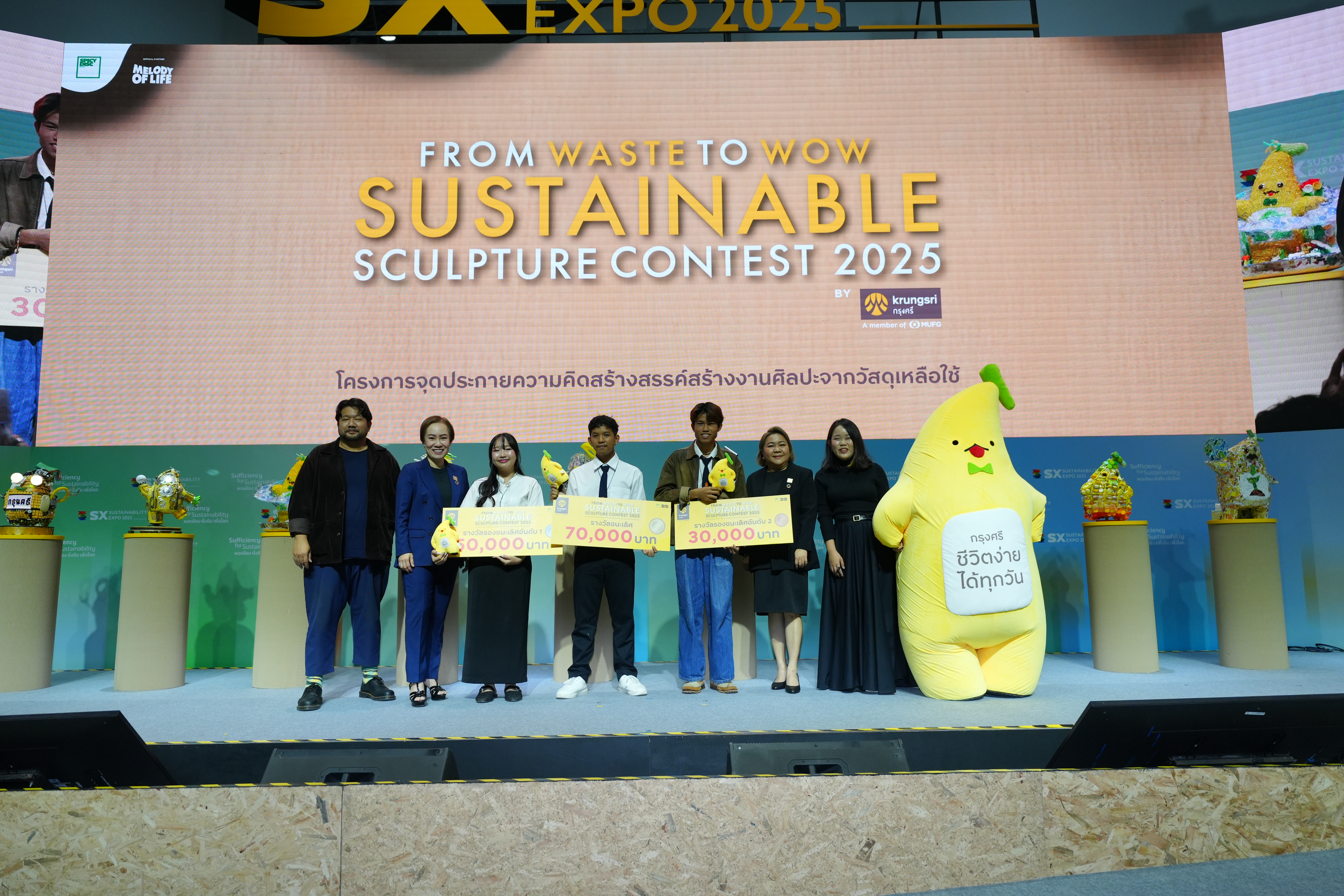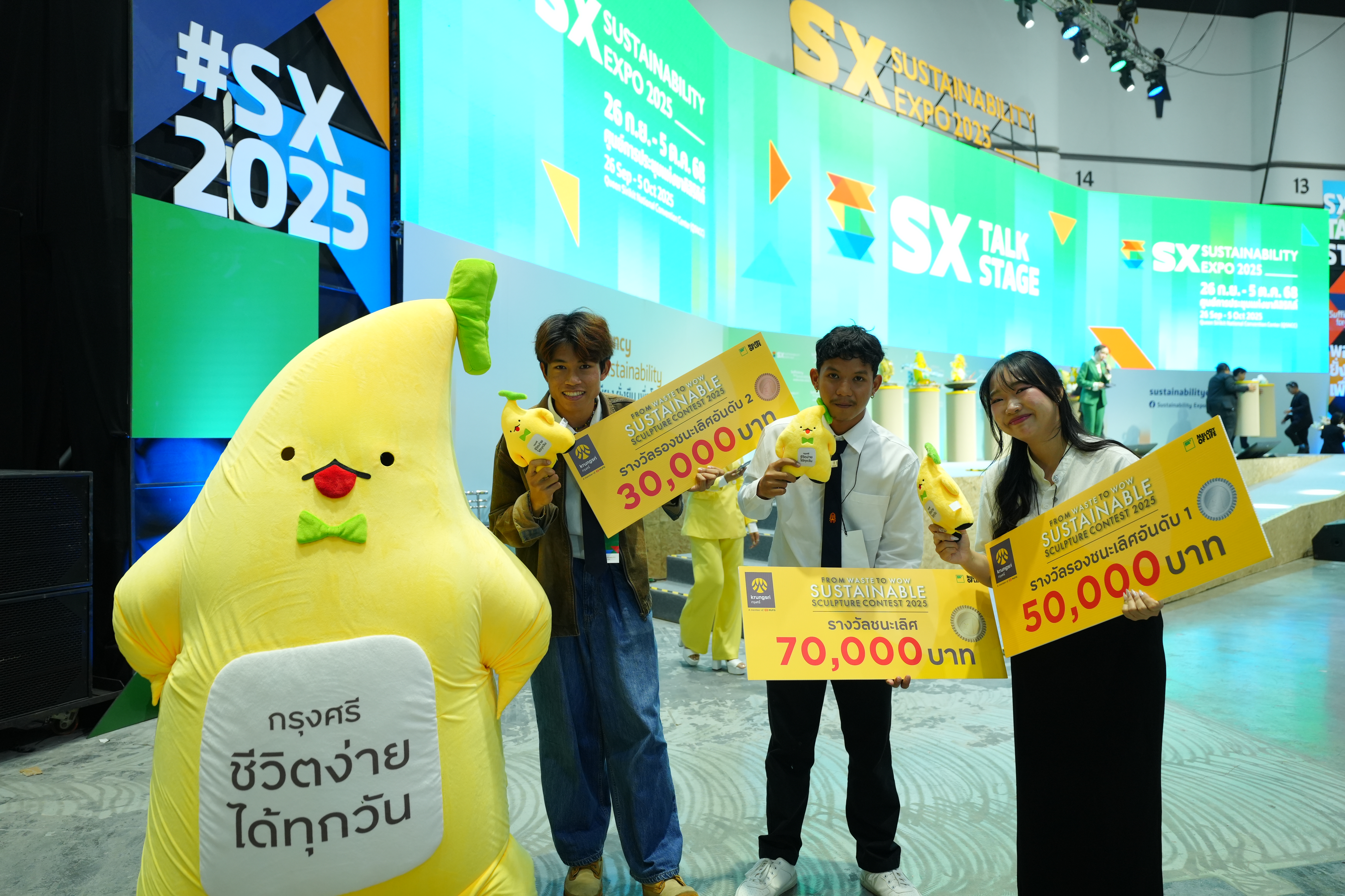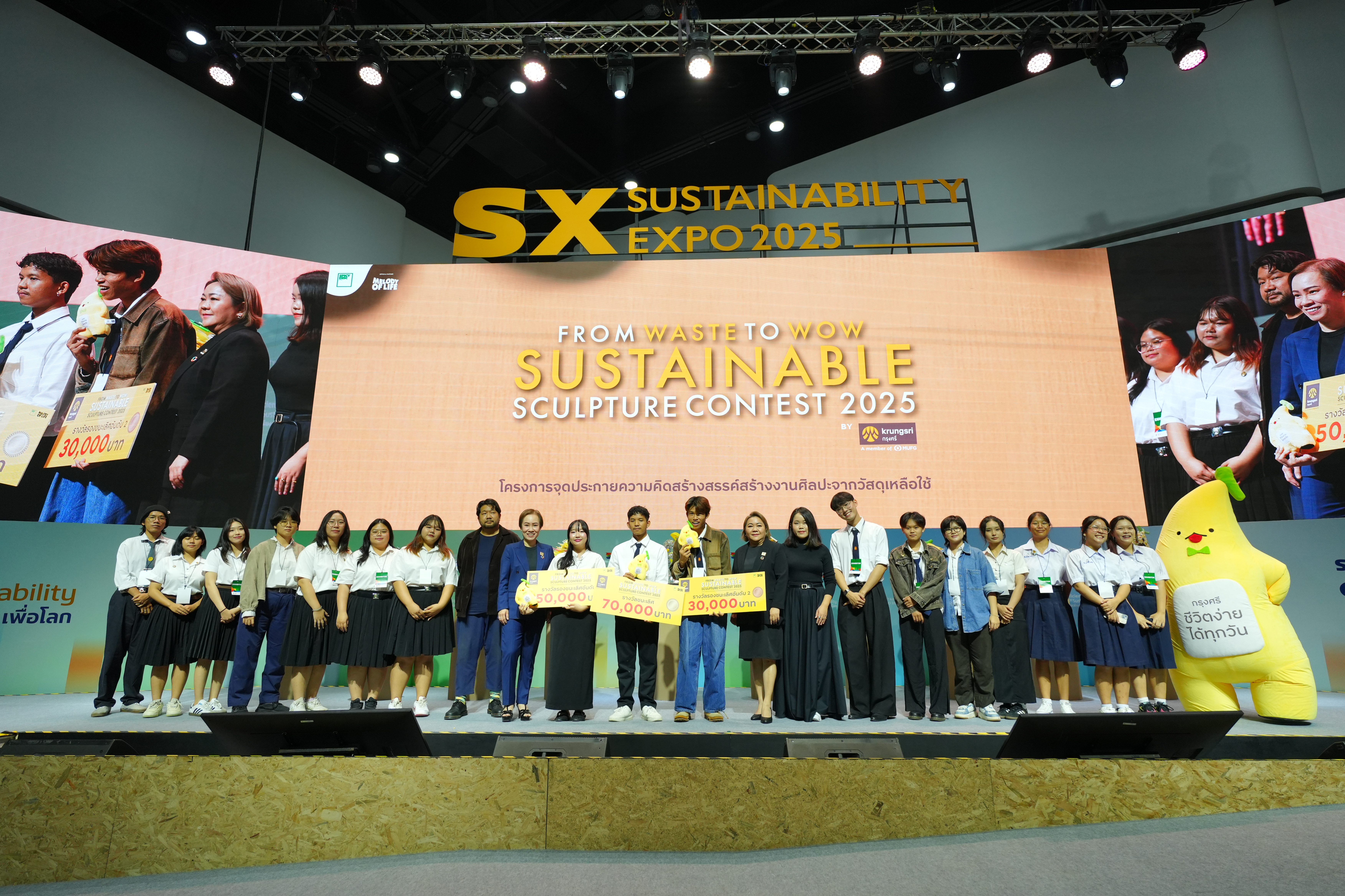 เสียงปรบมือดังกึกก้องบนเวที SX TALK STAGE ภายในงาน SUSTAINABILITY EXPO 2025 (SX2025) มหกรรมด้านความยั่งยืนที่ใหญ่ที่สุดในอาเซียน เมื่อธนาคารกรุงศรีอยุธยา จำกัด (มหาชน) ร่วมกับ บริษัท สไปร์ซซี่ ดิสก์ จำกัด ประกาศผลสุดยอดไอเดียสร้างสรรค์ในโครงการ “From Waste to WOW Sustainable Sculpture Contest 2025 by Krungsri” เวทีที่เปิดโอกาสให้คนรุ่นใหม่ อายุ 15-25 ปี ได้เปลี่ยนวัสดุเหลือใช้ให้กลายเป็นงานศิลปะอันทรงคุณค่า ผ่านการออกแบบ ‘ประติมากรรมน้องกล้วยกรุงศรี’ จากวัสดุรีไซเคิล ภายใต้แนวคิด “Go Sustainable with Krungsri ไปกับน้องกล้วย” เพื่อสร้างสมดุลและโลกที่ดีกว่า ท่ามกลางผลงานที่ส่งเข้าประกวดกว่า 120 ชิ้น