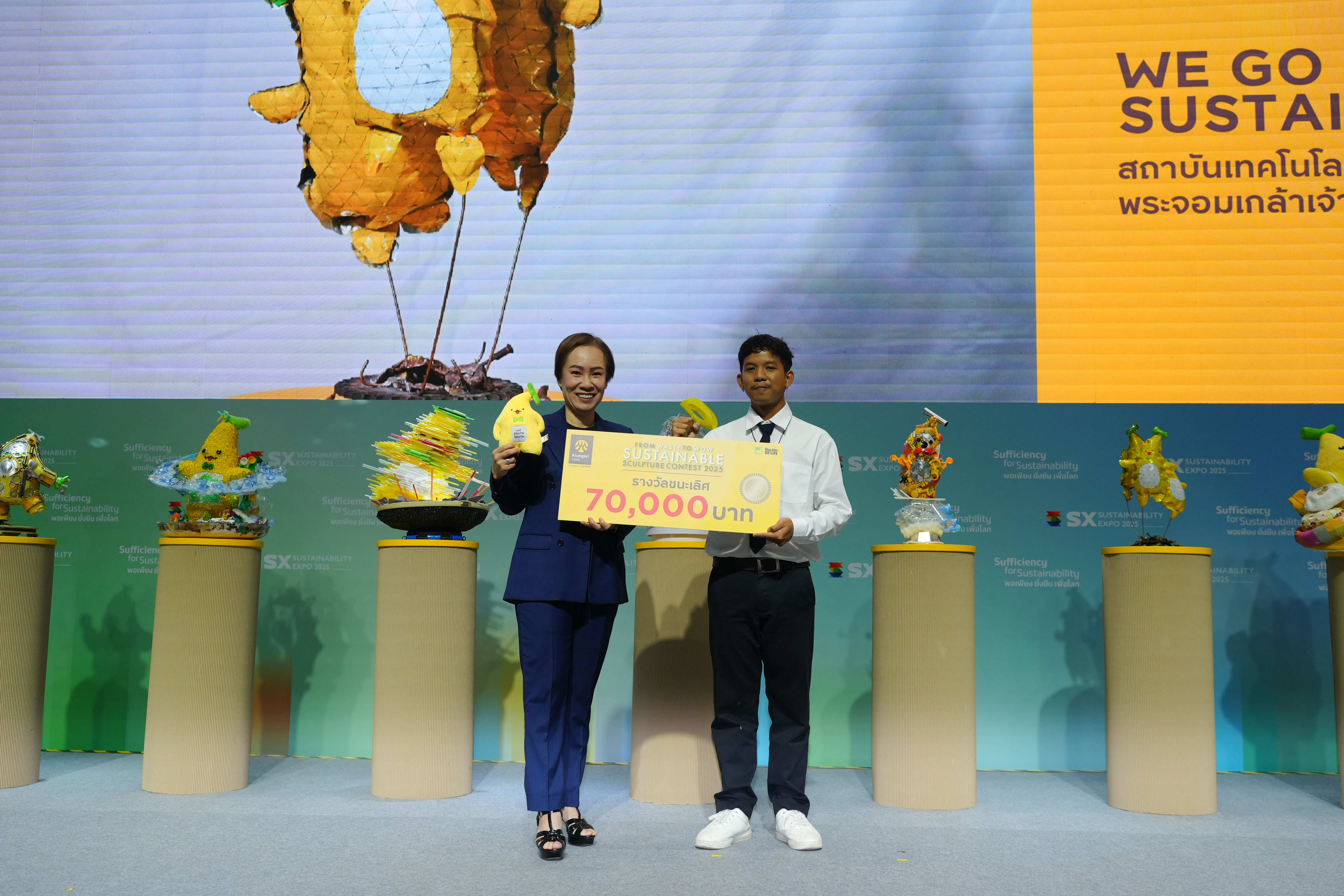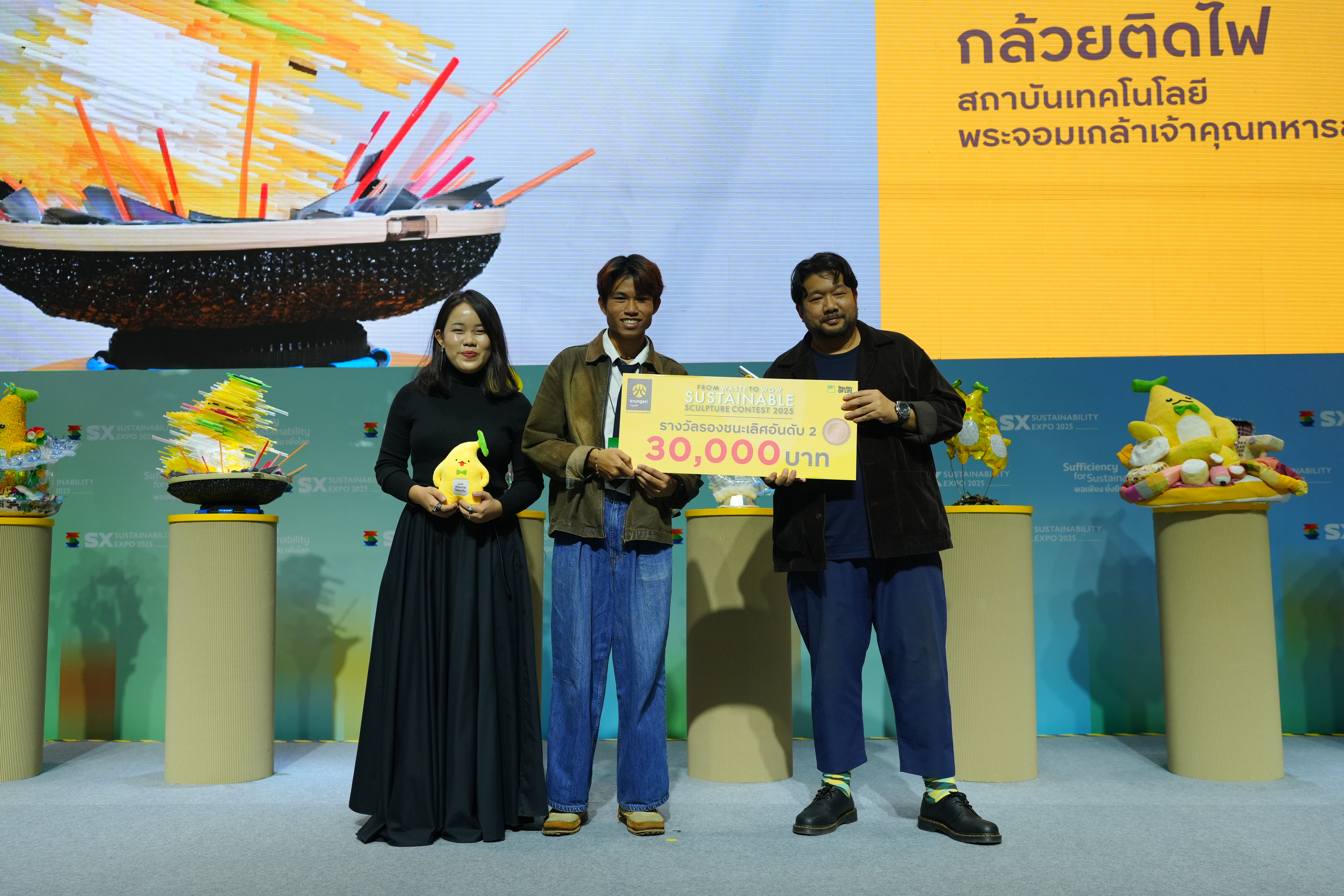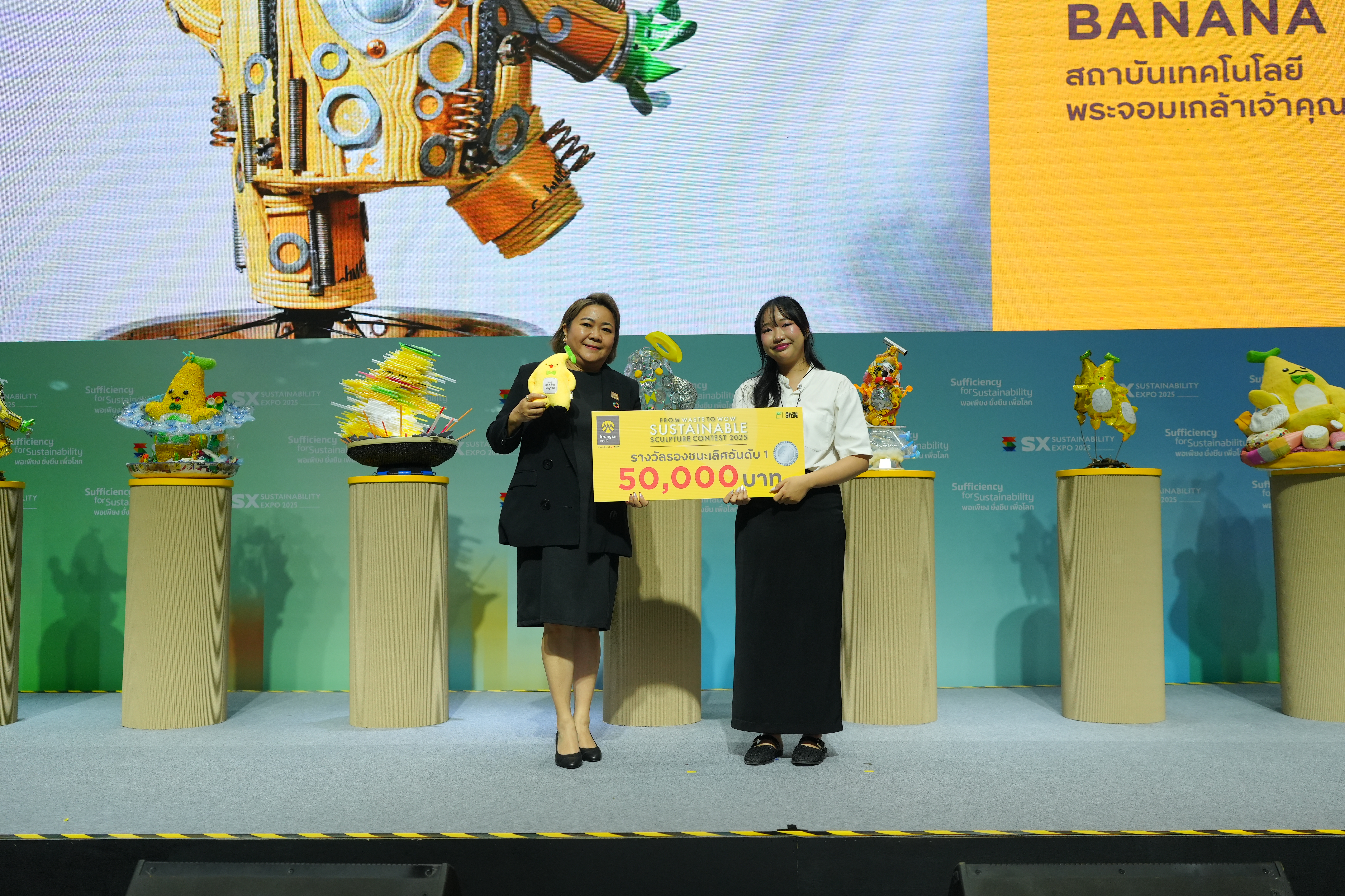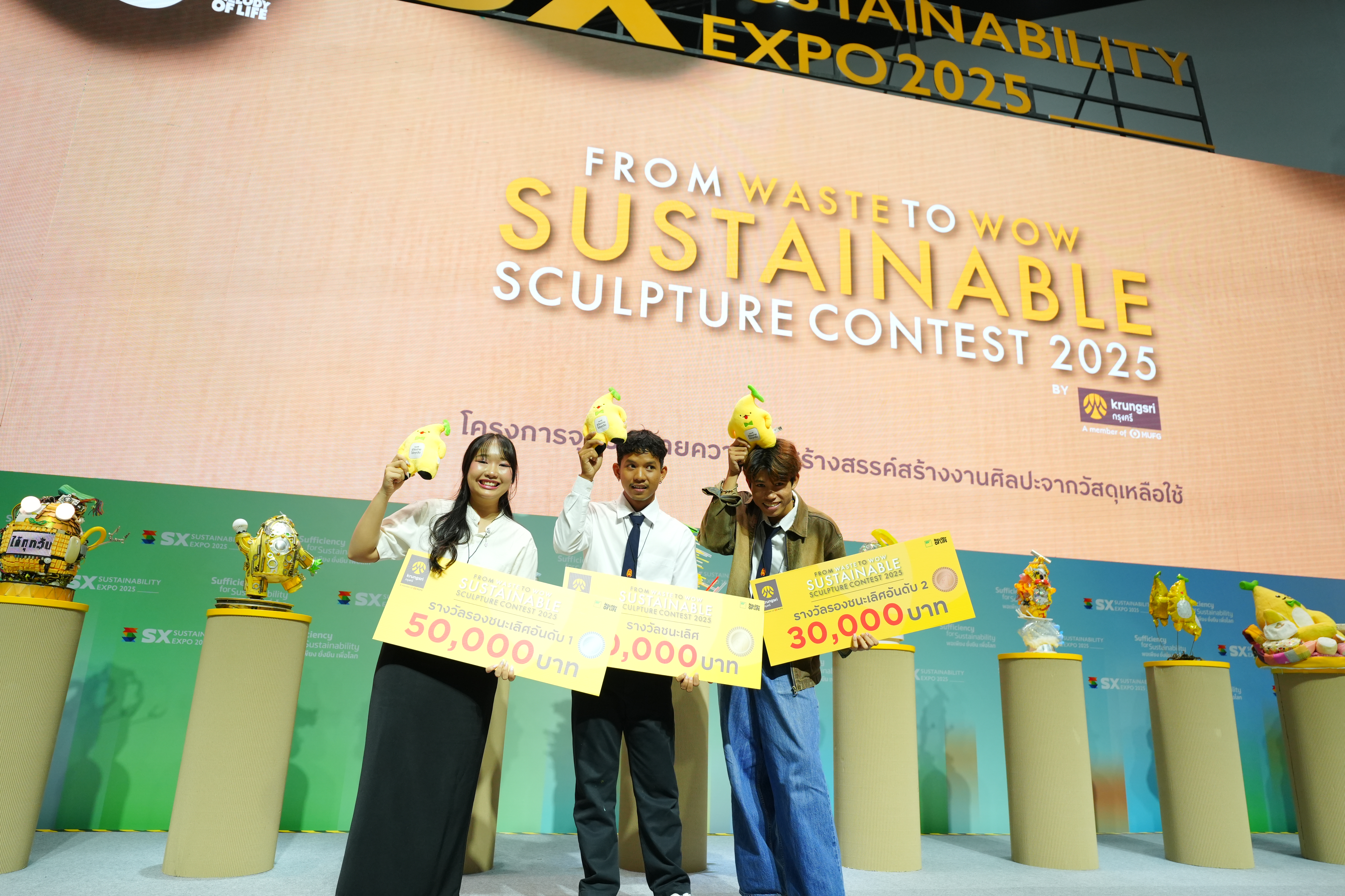 เสียงปรบมือดังกึกก้องบนเวที SX TALK STAGE ภายในงาน SUSTAINABILITY EXPO 2025 (SX2025) มหกรรมด้านความยั่งยืนที่ใหญ่ที่สุดในอาเซียน เมื่อธนาคารกรุงศรีอยุธยา จำกัด (มหาชน) ร่วมกับ บริษัท สไปร์ซซี่ ดิสก์ จำกัด ประกาศผลสุดยอดไอเดียสร้างสรรค์ในโครงการ “From Waste to WOW Sustainable Sculpture Contest 2025 by Krungsri” เวทีที่เปิดโอกาสให้คนรุ่นใหม่ อายุ 15-25 ปี ได้เปลี่ยนวัสดุเหลือใช้ให้กลายเป็นงานศิลปะอันทรงคุณค่า ผ่านการออกแบบ ‘ประติมากรรมน้องกล้วยกรุงศรี’ จากวัสดุรีไซเคิล ภายใต้แนวคิด “Go Sustainable with Krungsri ไปกับน้องกล้วย” เพื่อสร้างสมดุลและโลกที่ดีกว่า ท่ามกลางผลงานที่ส่งเข้าประกวดกว่า 120 ชิ้น
